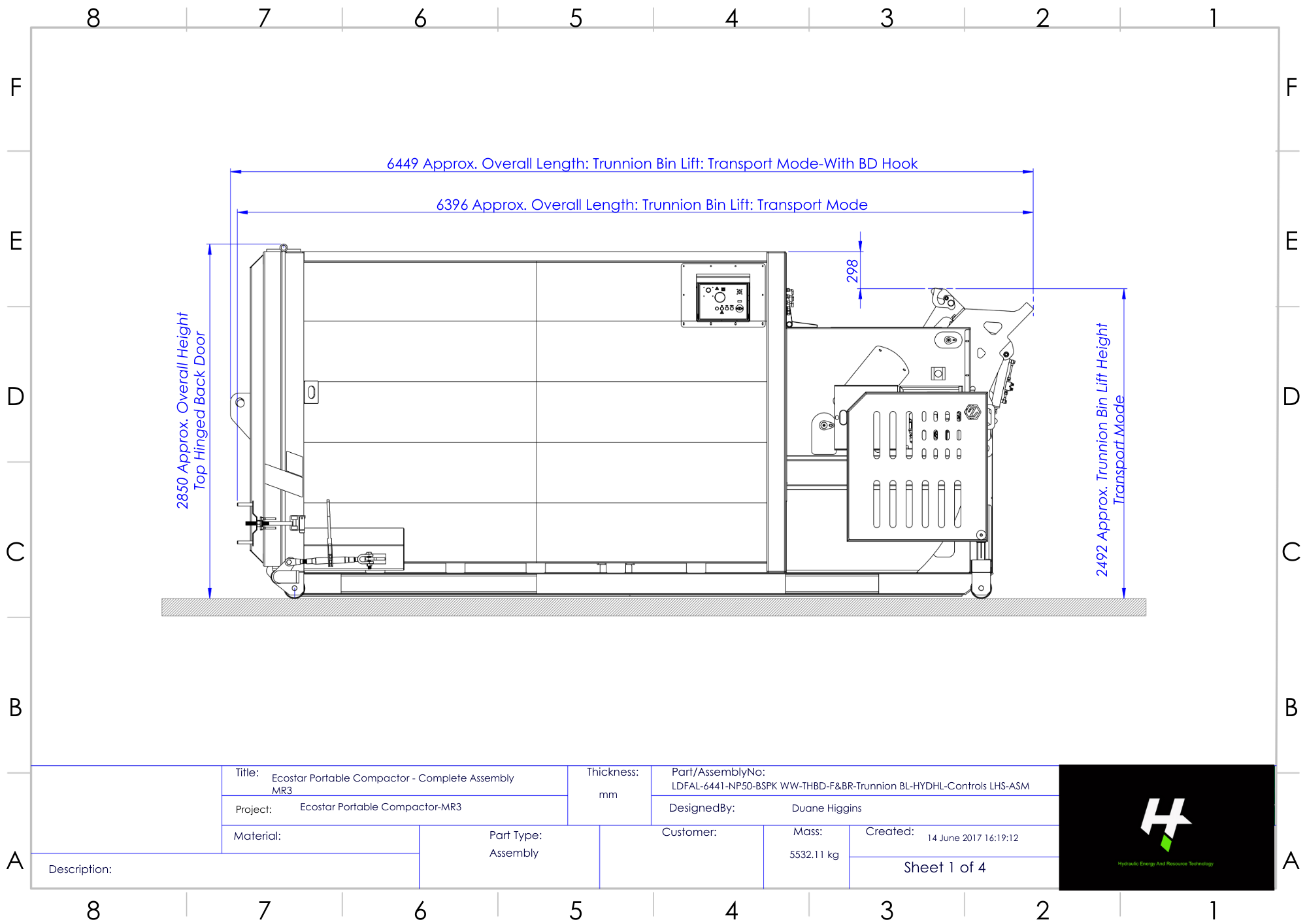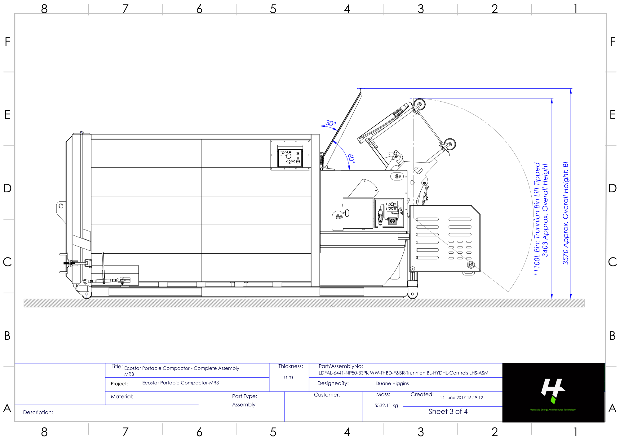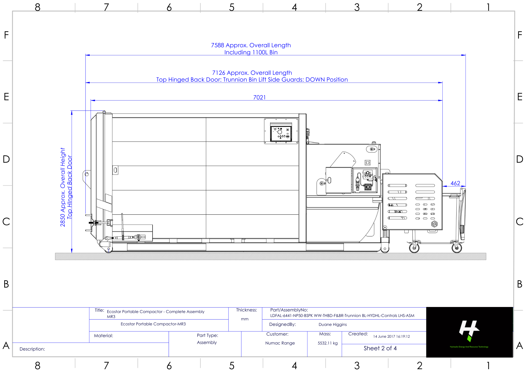 | Height | 2850 mm (Top Hinged Back Door) 3658 mm Overall Height (Hydraulic Lid & 1100L Bin Tipped) |