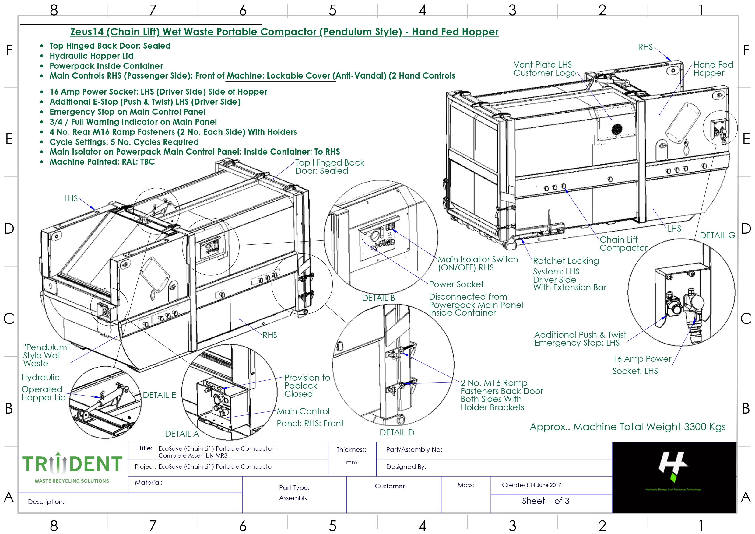The Zeus14 Wet Waste Portable Compactor with Hand-Fed Front Loading and Hydraulic Lid is a robust and space-efficient solution designed specifically for handling wet and food waste in demanding environments. Combining compaction and storage in a single sealed unit, it helps maintain high levels of hygiene while reducing waste volume and improving overall site efficiency.